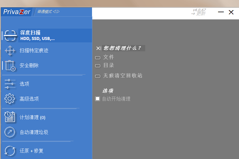 privaZer绿色版是一款功能十分强大的电脑清理工具,它能完全清楚系统中残留的任何网站浏览痕迹和几率,不仅仅是浏览器的浏览足迹,包括电脑中的其他程序的浏览痕迹也能完美清除。pri…